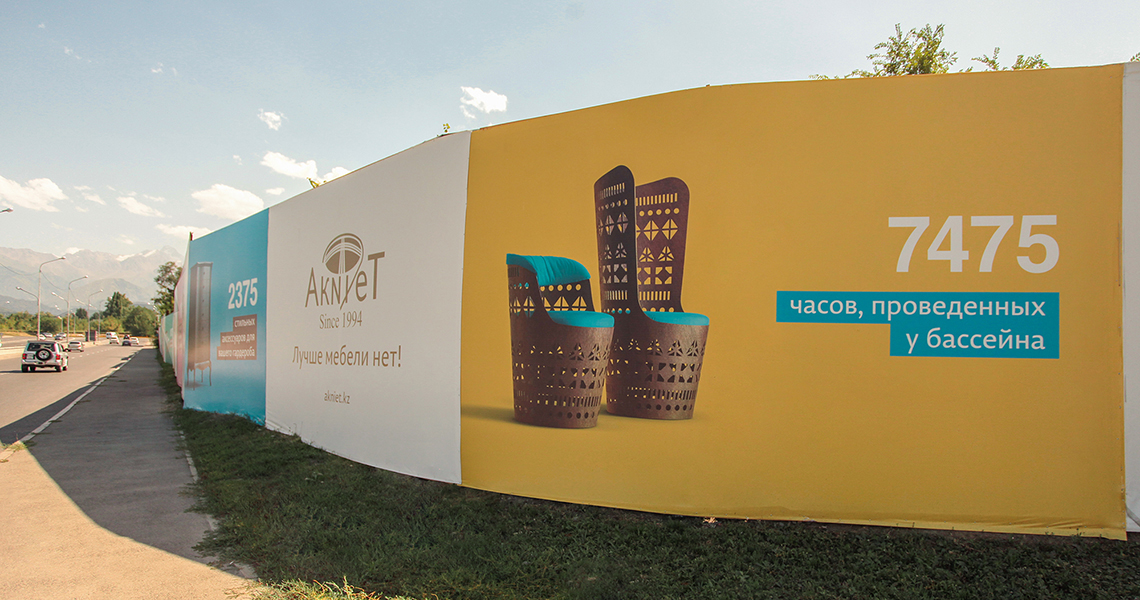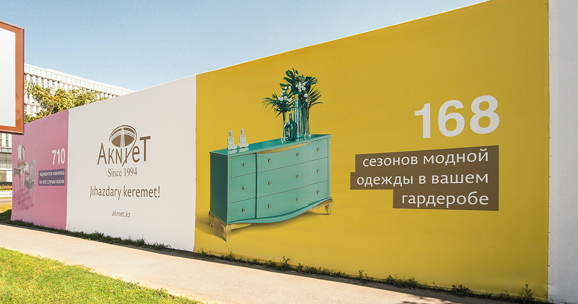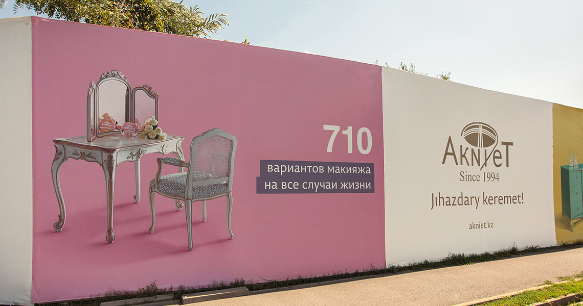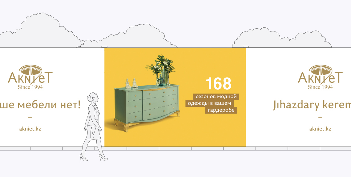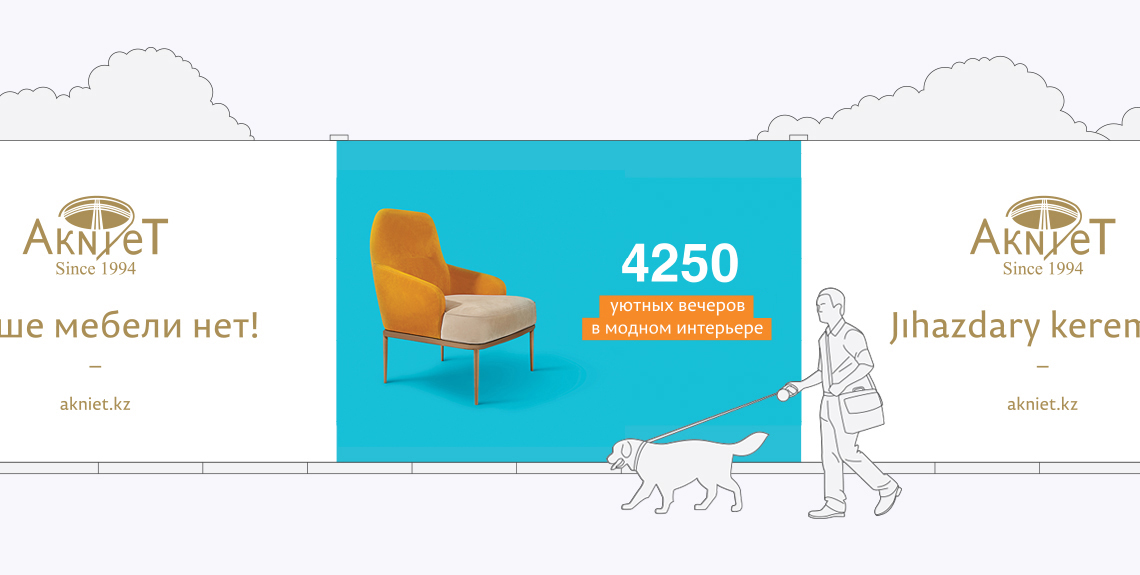Мебельная компания «Акниет» существует на рынке Казахстана 24 года. За этот большой срок аудитория бренда помолодела и для «Акниет» стояла задача обновить наружние баннеры с учетом трендов и молодой аудитории. Наша студия разработала 24 баннера с яркими фонами и уникальным копирайтом.